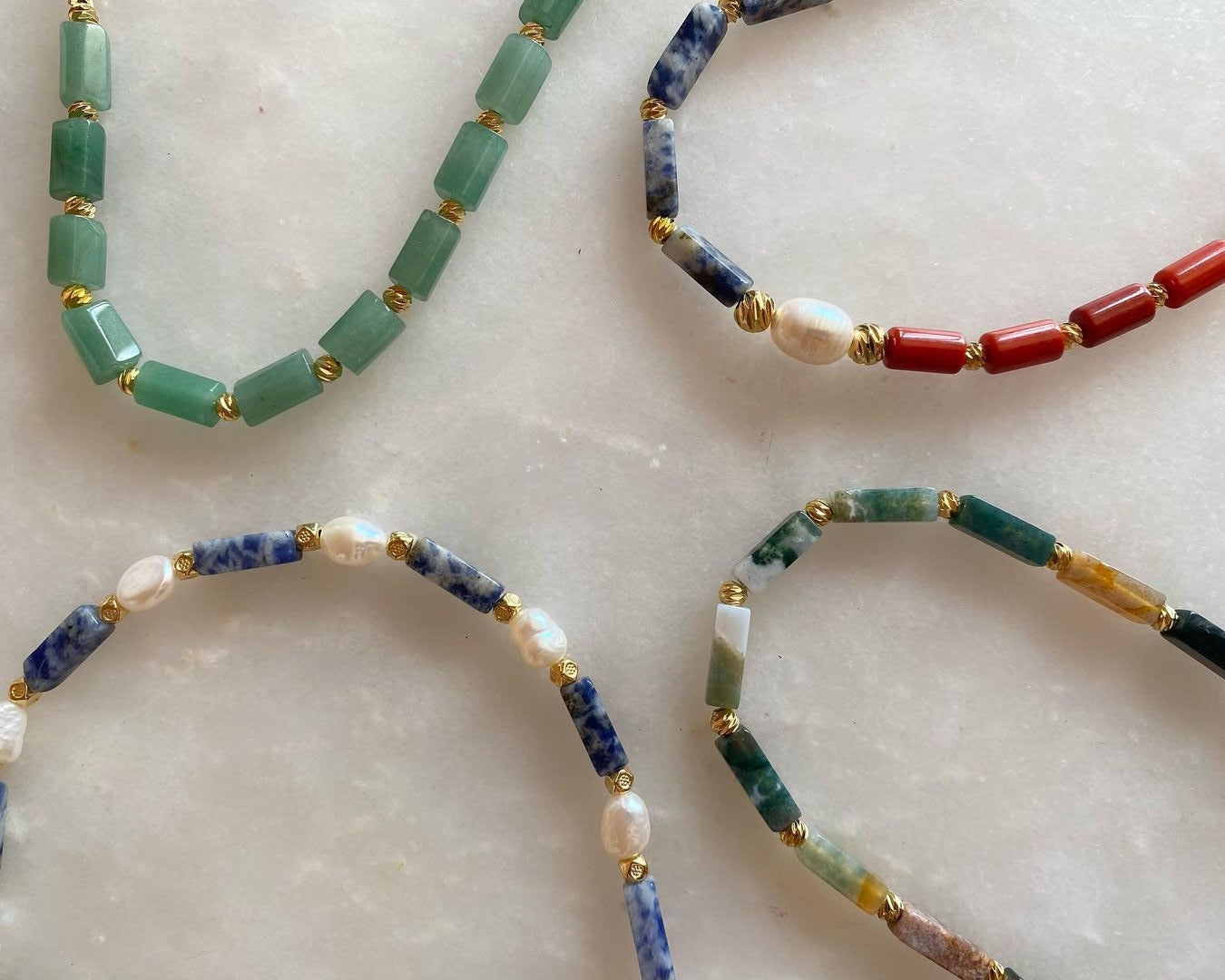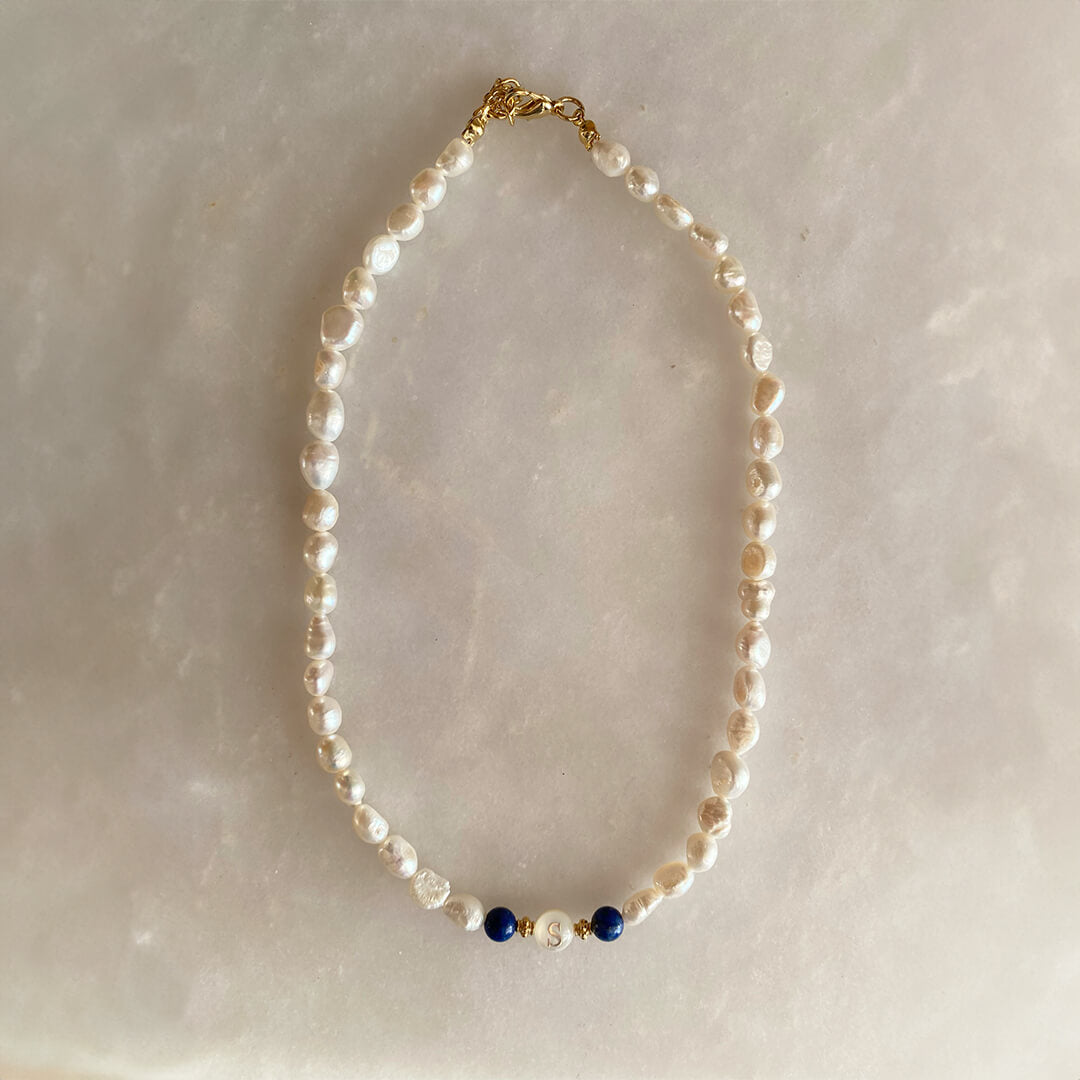 Barok incilerin doğal ışıltısı, kişiselleştirilebilir sedef harf detayı ve lapis lazuli taşının derin mavisi bu kolyede buluşuyor.